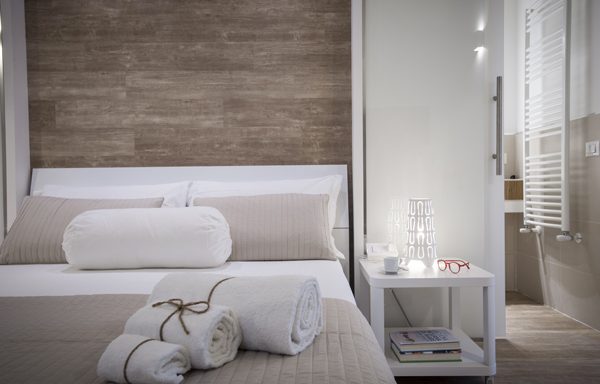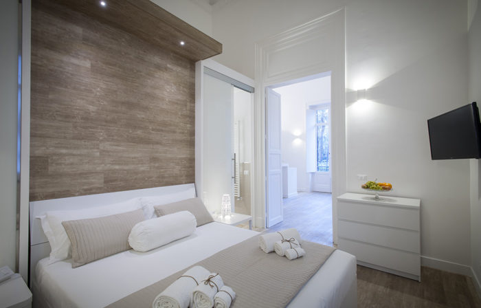 a room with a large window, equipped with king-size bed, 32″ TV, a bathroom with shower, WC, bidet, heated towel rail, hairdryer and courtesy kit.