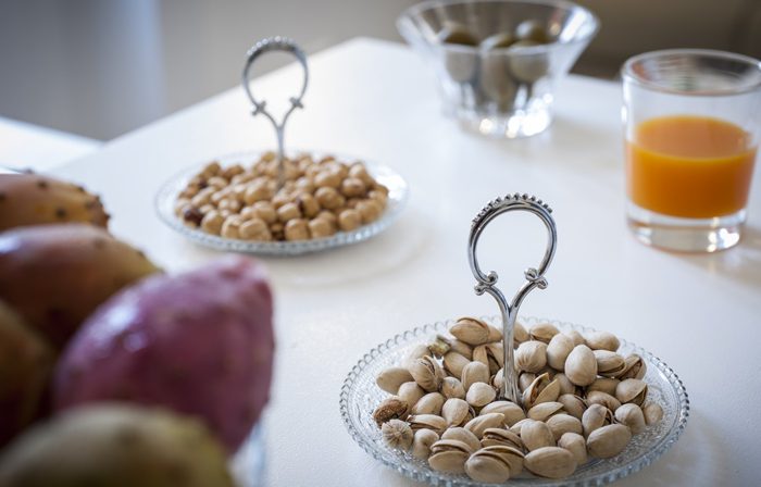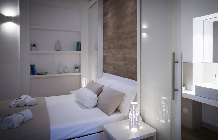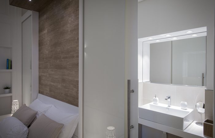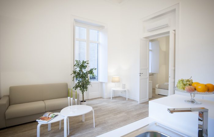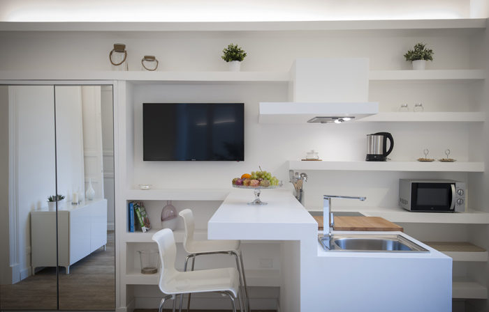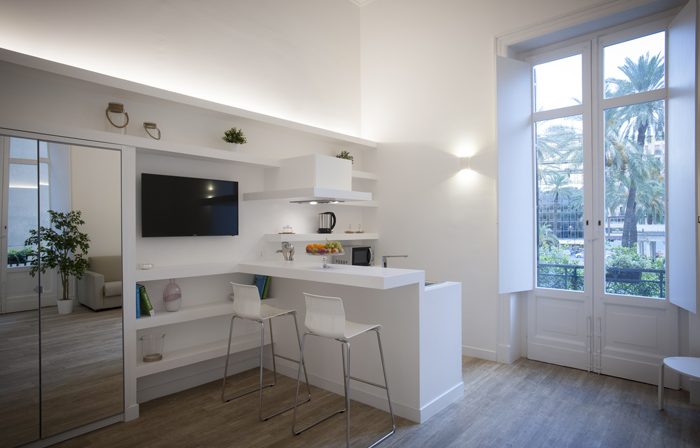 a large living area with sofa bed, 40″ TV, American style kitchen equipped with induction hob, refrigerator, microwave oven and electric kettle, a wardrobe, two panoramic balconies;