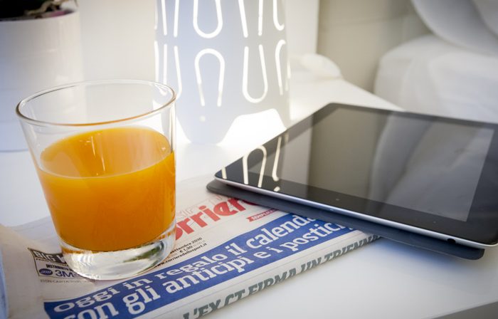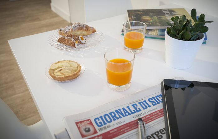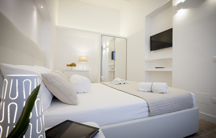 a room equipped with king-size bed, 32″ TV, a wardrobe, a dresser, a bathroom with shower, WC, bidet, heated towel rail, hairdryer and courtesy kit.
